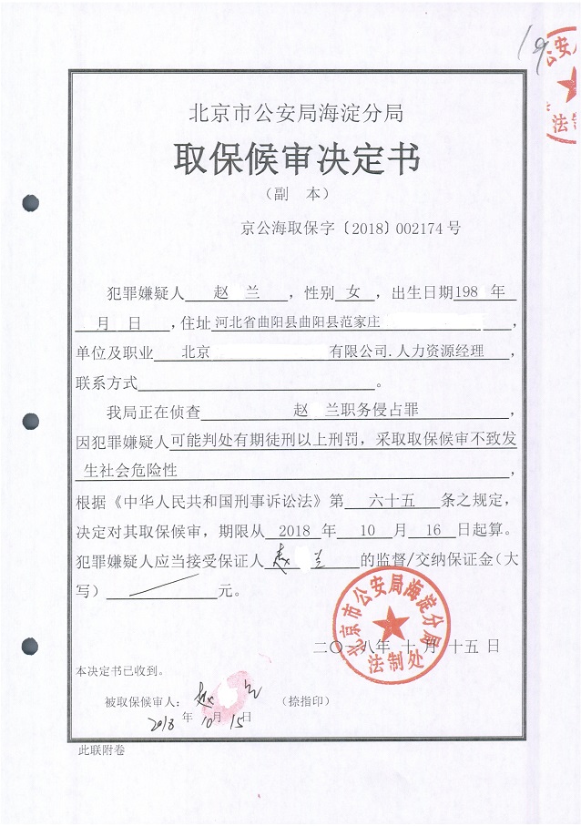 赵某某职务侵占60万余元取保候审案(点击查看不起诉决定书) |