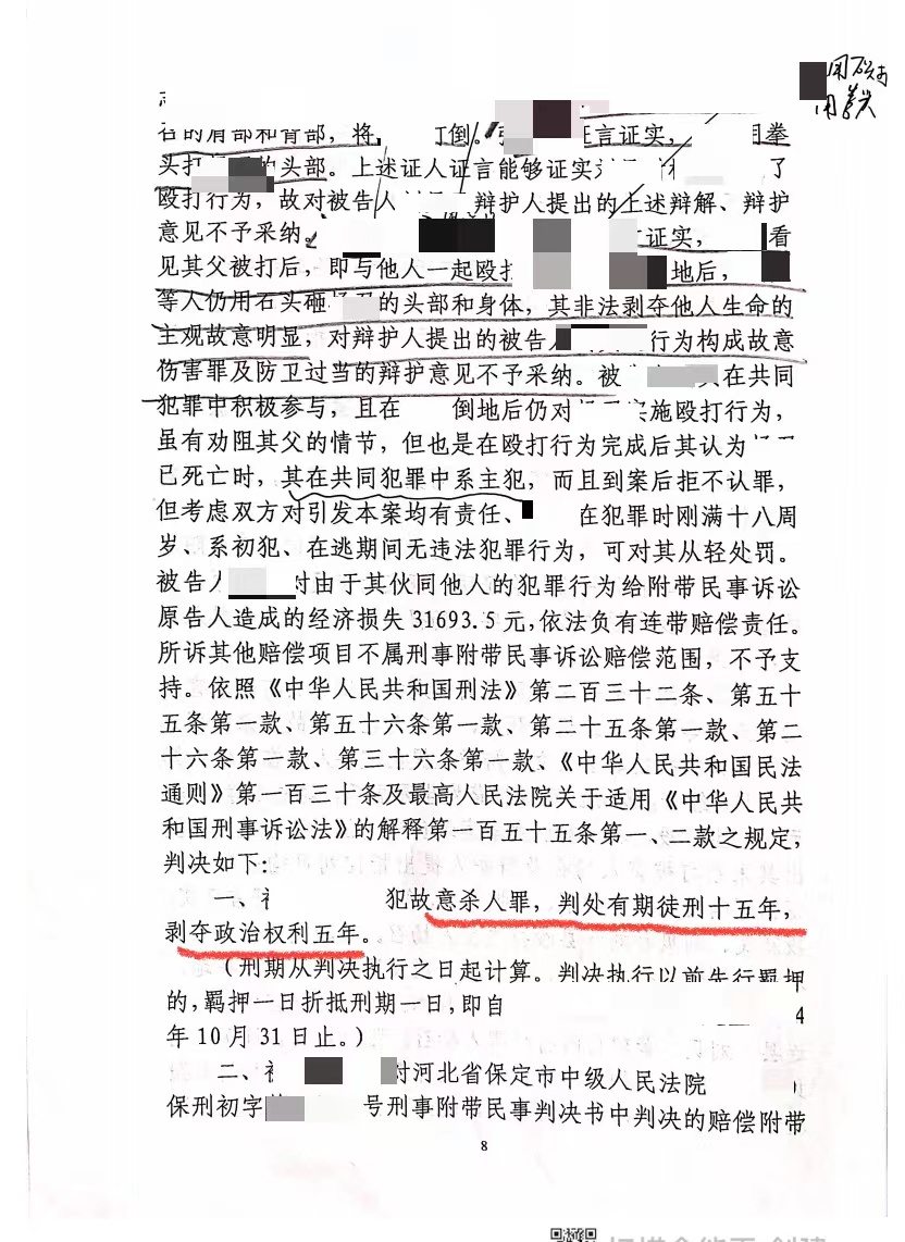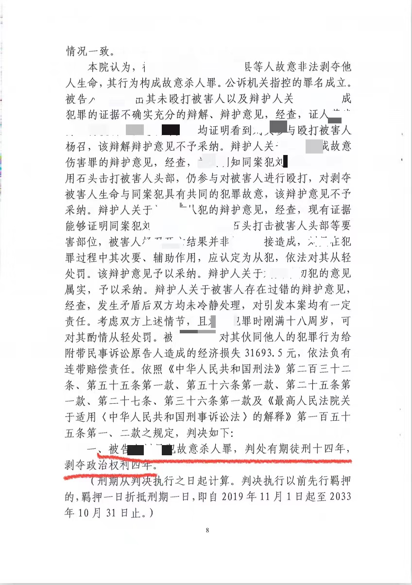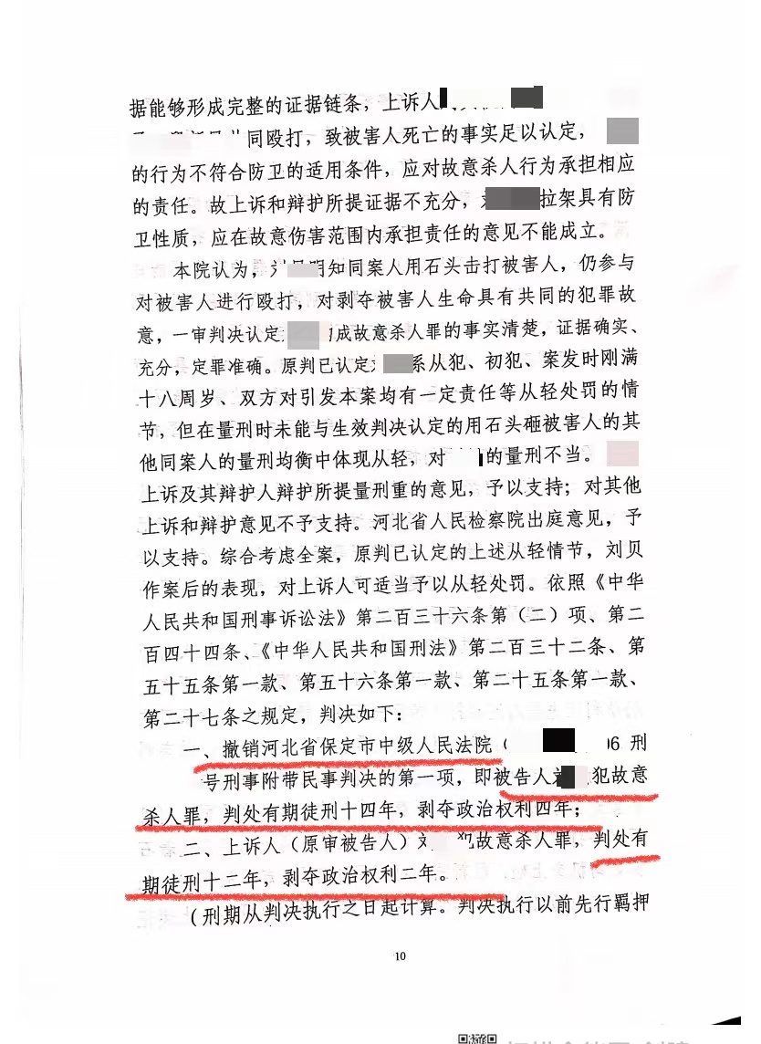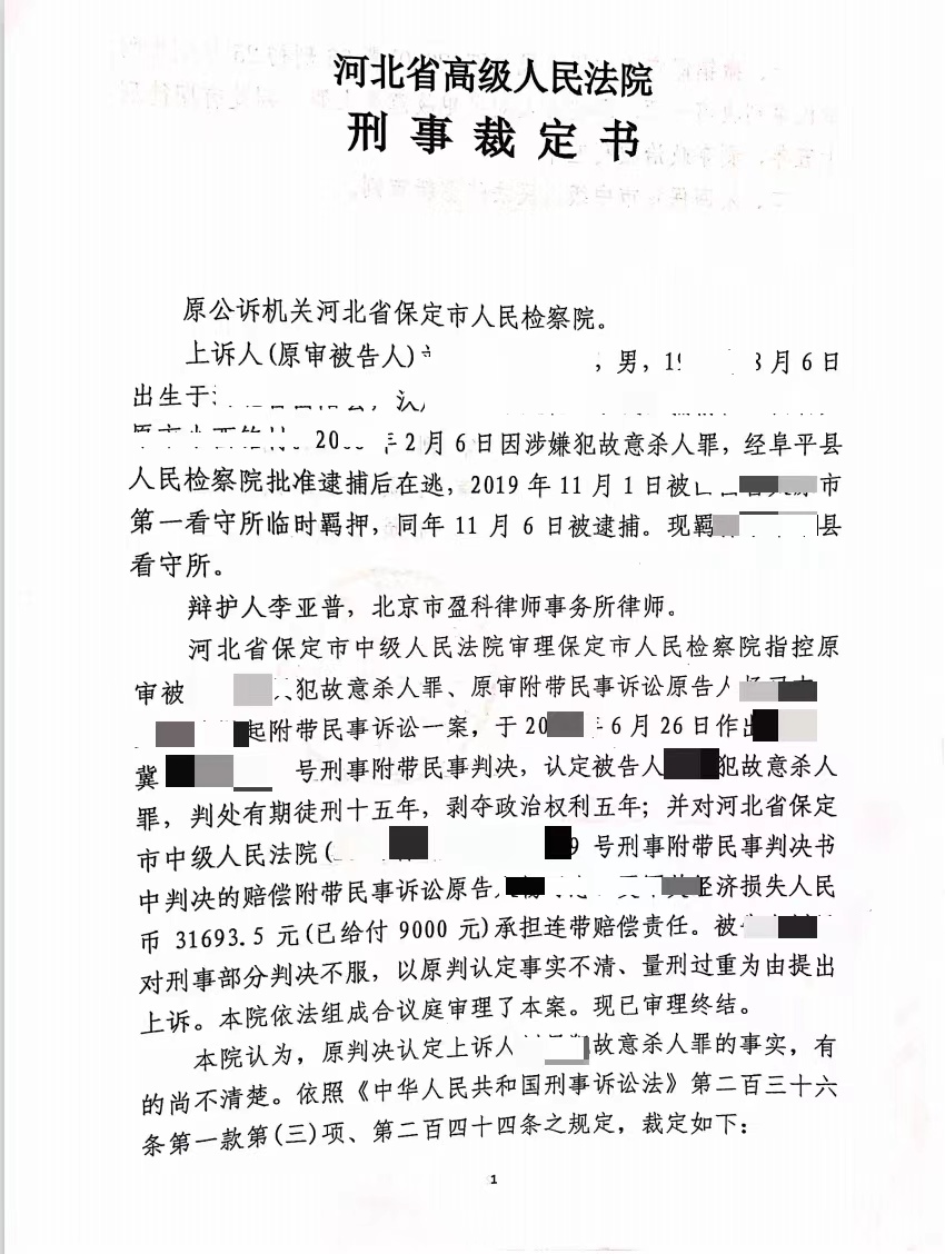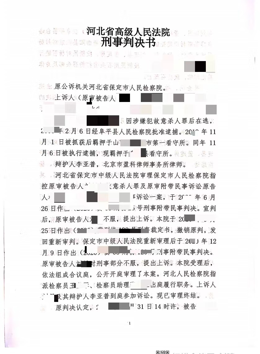 刑事案件当事人的合法权益是和律师的坚持分不开的。这是我代理的一起故意杀人案件。案件发生在2004年,案发后,被告人的父亲等三人被抓获归案,其父被判死缓,另外两个人也被判处了无期徒刑和十四年有期徒刑。被告人从案发后一直潜逃,2019年在潜逃十五年后被抓获。因为其父亲在04年已经被判处了死缓,该案从19年1月被告人被抓获到今天的终审近三年之久,审理了四次,一审中院判处了被告人十五年有期徒刑,上诉后高院发回重审,中院改判了十四年有期徒刑,再次上诉后高院改判了十二年有期徒刑。