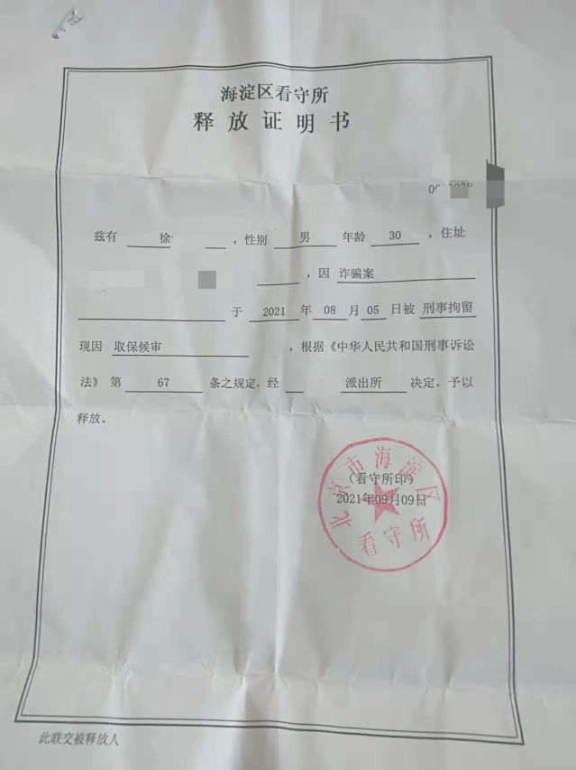 以销售收藏品进行诈骗,取保候审(点击查看释放证明书) |